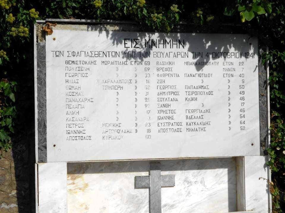 6η Οκτωβρίου 1941. Επιστρέφει στο χωριό ο Πρόεδρος Βόρις Στόεφ και συγχαίρει τον Στογιάνοφ γιατί, δήθεν, κατόρθωσε να επιβάλει την τάξη. Το απόγευμα της ίδιας μέρας μια σειρά από κάρα φορτωμένα με τα προϊόντα της λεηλασίας ξεκινά για την Καβάλα. Όμως ο χορός του αίματος δεν τελείωσε ακόμη. ΄Έξω από το χωριό στη θέση Αλώνια εκτελούν τον Γιώργο Μωραιτίδη 33 ετών. Ήταν το τελευταίο θύμα της επιχείρησης εκκαθάρισης και τρομοκρατίας των φασιστικών βουλγάρικων δυνάμεων κατοχής".