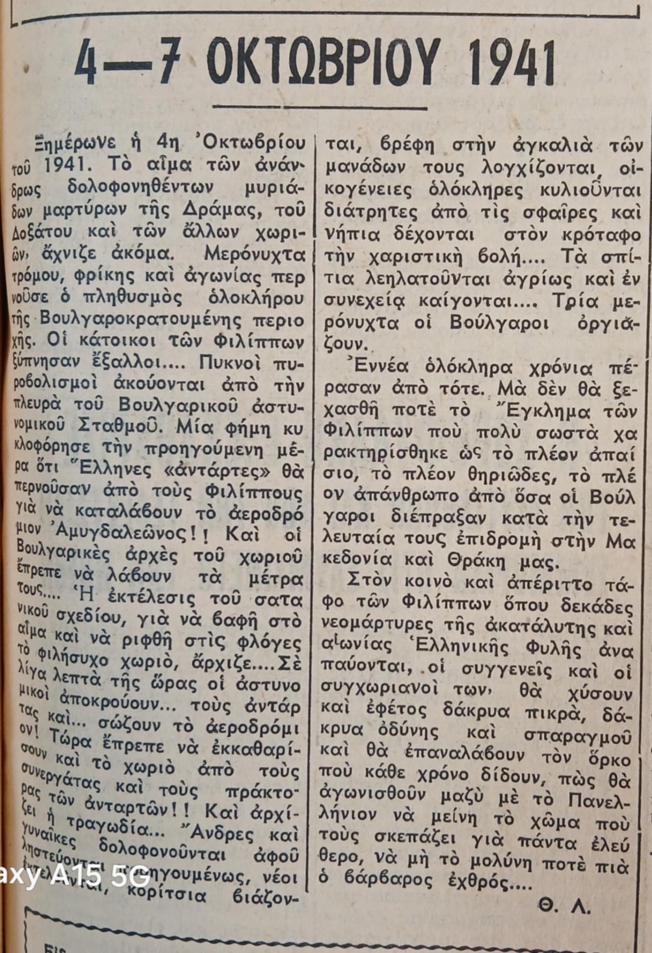 Η σφαγή ξεκίνησε στις 4 Οκτωβρίου του 1941, ολοκληρώθηκε στις 6 Οκτωβρίου και σημάδεψε την ζωή των κατοίκων του χωριού. Κλίνουμε ευλαβικά το γόνυ στην μνήμη των κατοίκων των Φιλίππων. Θυμόμαστε ..ΔΕΝ ΞΕΧΝΟΥΜΕ.